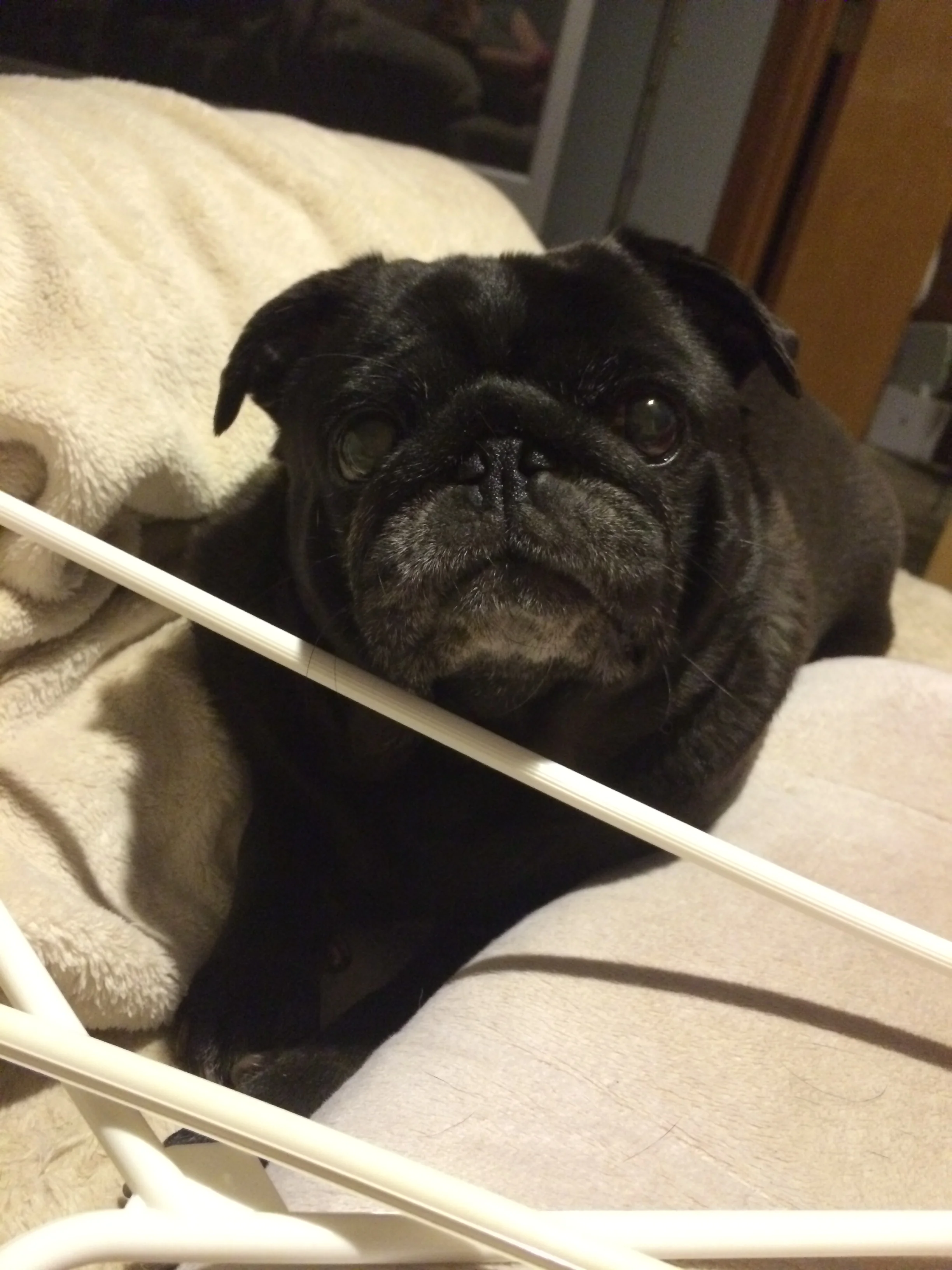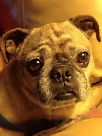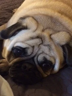 Stella was found on the side of a road and dropped off with our vet. Those eyes melted my husband's heart and he brought her home. Unfortunately for him she bonded to me more and followed me everywhere, Her favorite place was on the couch, her favorite activity was eating. She developed mast cell cancer and it got bad fast. We couldn't let her suffer for our benefit so now she is gone. Pugs are the best little buddies ever! MIss you dear Stella!